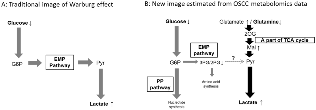 (A) The traditional image of the Warburg effect; and (B) a new concept based on metabolomic data obtained from OSCC samples. Gray bold arrows: metabolic flows derived from glucose metabolism; Black bold arrows: metabolic flows derived from glutaminolysis; Small arrows with metabolite names: a significant increase (upward arrow) or reduction (downward arrow) in the levels of the named metabolites; See Figure 1 for an explanation of the metabolite abbreviations.