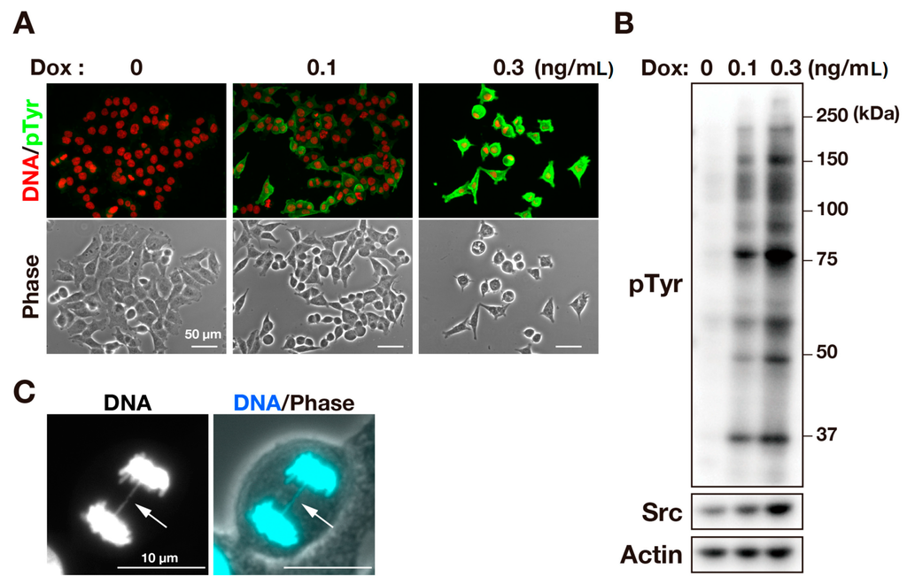 The cell clone used in this study is capable of expressing v-Src upon Dox treatment. The expression levels of v-Src depend on the concentration of Dox added to the culture. This has a benefit for the investigation of v-Src, since v-Src expression at higher levels induces a variety of effects including detachment of cells from culture dish. However, v-Src that was induced by low concentration of Dox for a long time induces an increase in protein-tyrosine phosphorylation without detachment of cells. Therefore, when cells are examined for DNA damage induction in a short period, cells were treated with higher concentration of Dox at 1 μg/mL. On the contrary, when cells were examined for chromosome bridge formation for three days, cells were treated with lower concentration of Dox at 0.1–0.3 ng/mL.