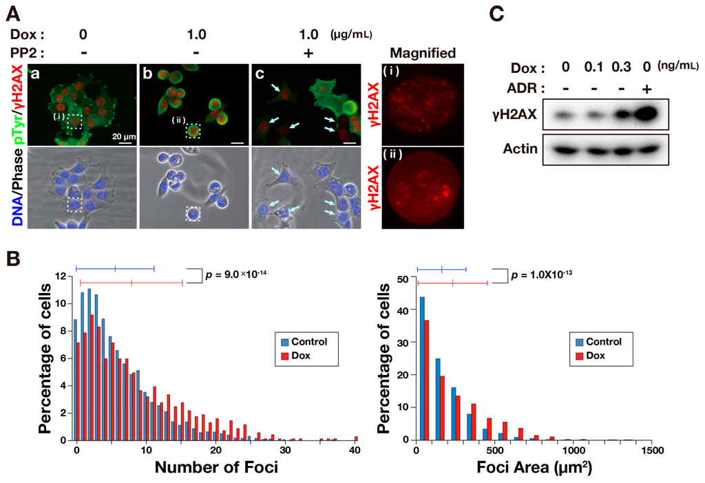Adriamycin (Sigma-Aldrich, St. Louis, MO, USA) and bleomycin (Nihonkayaku, Tokyo, Japan) were used to induce DNA damage at concentrations of 300 ng/mL and 4.46 μg/mL (3.0 μM), respectively. Caffeine (Wako, Osaka, Japan) was used at 2 mM for 24 h. These chemicals were dissolved in distilled water as stock solutions. PP2 (Calbiochem, San Diego, CA, USA), a selective inhibitor for the Src family kinase, was dissolved in dimethyl sulfoxide and used at 10 μM.
