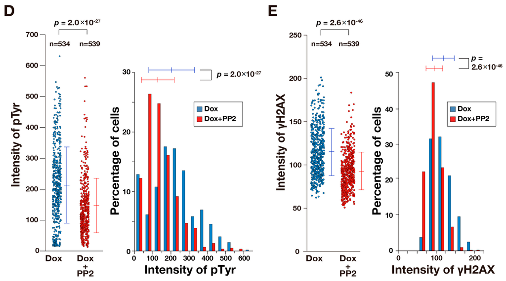 We next used the Src selective inhibitor PP2 to examine whether DNA damage was associated with the kinase activity of v-Src. HCT116/v-Src cells were treated with Dox and with or without PP2, stained for phosphotyrosine and γH2AX (Figure 2(Ab,Ac)), and analyzed by a high-content automated imaging system. Fluorescence intensities of phosphotyrosine staining are shown in a dot plot (Figure 2D left) and a histogram (Figure 2D right). Both graphs show that a PP2 treatment reduced the level of tyrosine phosphorylation, suggesting an inhibition of v-Src kinase activity by PP2. Fluorescence intensities of γH2AX presented in the dot plot (Figure 2E left) and the histogram (Figure 2E right) show a decrease in the levels of γH2AX with a PP2 treatment. Furthermore, the cells that are indicated by arrows in Figure 2(Ac) exhibit lower levels of both γH2AX signals and phosphotyrosine signals. These results suggest that tyrosine phosphorylation catalyzed by v-Src is involved in v-Src-induced DNA damage.
