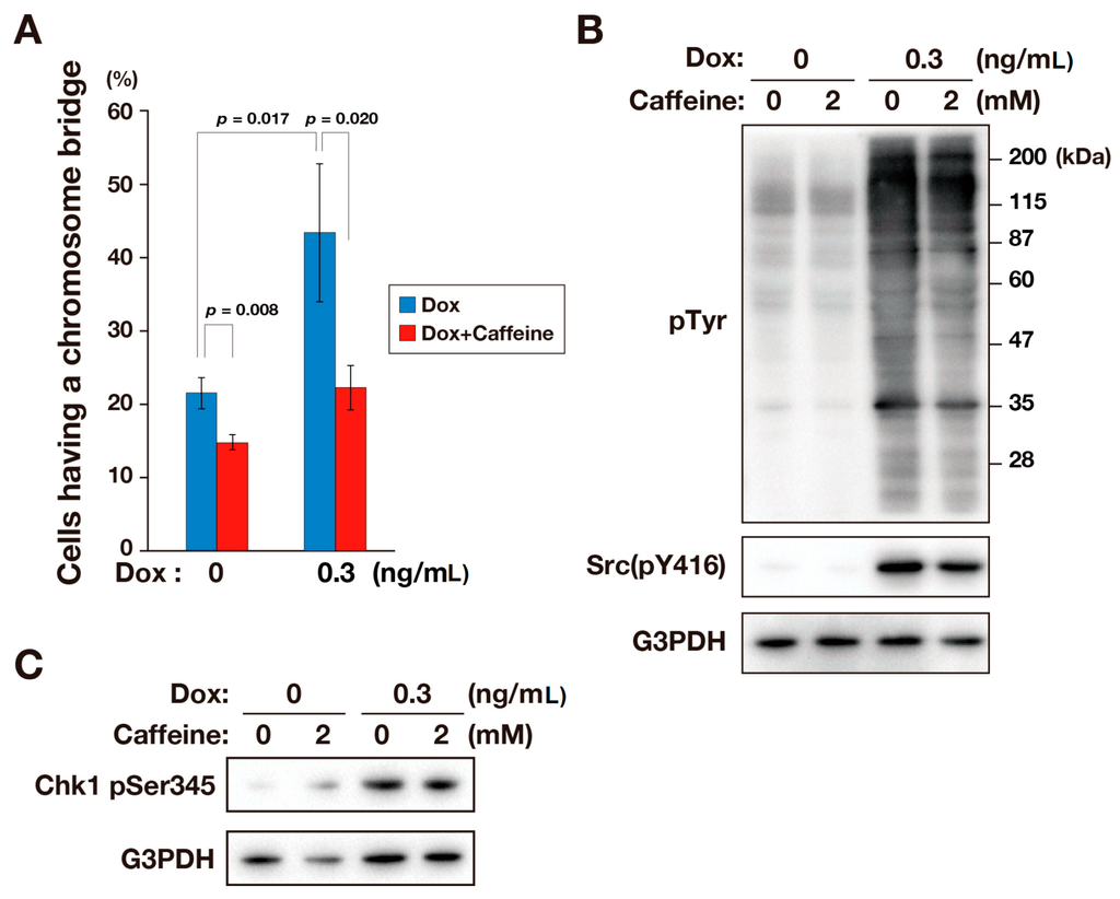 Caffeine inhibits the formation of chromosome bridges. HCT116/v-Src cells were cultured with Dox for three days at the indicated concentrations. The cells were treated with or without 2 mM caffeine for one day before fixation or lysate preparation. (A) The percentage of anaphase and telophase cells with a chromosome bridge were plotted. The results represent the mean ± S.D. from three independent experiments. p values were calculated using a two-tailed Student’s t-test; (B) Whole cell lysates were subjected to a Western blot analysis. Blots were probed with anti-phosphotyrosine (pTyr), anti-Src (pY416), and anti-G3PDH (loading control) antibodies; (C) Whole cell lysates were subjected to a Western blot analysis. Blots were probed with anti-Chk1 pSer345 and anti-G3PDH (loading control) antibodies. In B and C, a representative result of two independent experiments is shown.