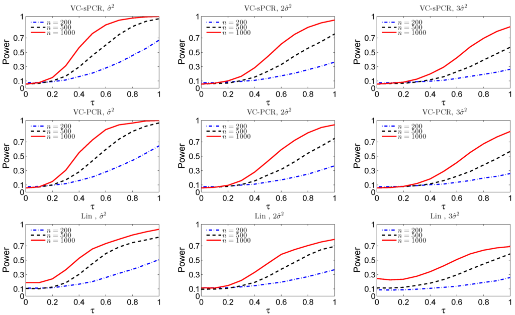 where and , , are the estimators of and based on the real data for gene NCOA5, is the kth sparse PC in the bootstrapped samples with size , and ε is the error term following a normal distribution with mean 0 and variance , where c is a constant controlling the size of the variance, and is the estimated variance in real data based on gene NCOA5. τ is a constant to control the effect size of the model. When , we can assess the empirical false positive rate. When , we can assess the testing power and we expect the power increases as τ increases. We set the bootstrap sample size as , and the constant to check the finite sample performance of the proposed method. Specifically, we were interested in evaluating the false positive control and the power of detecting association under different sample sizes and error variances.