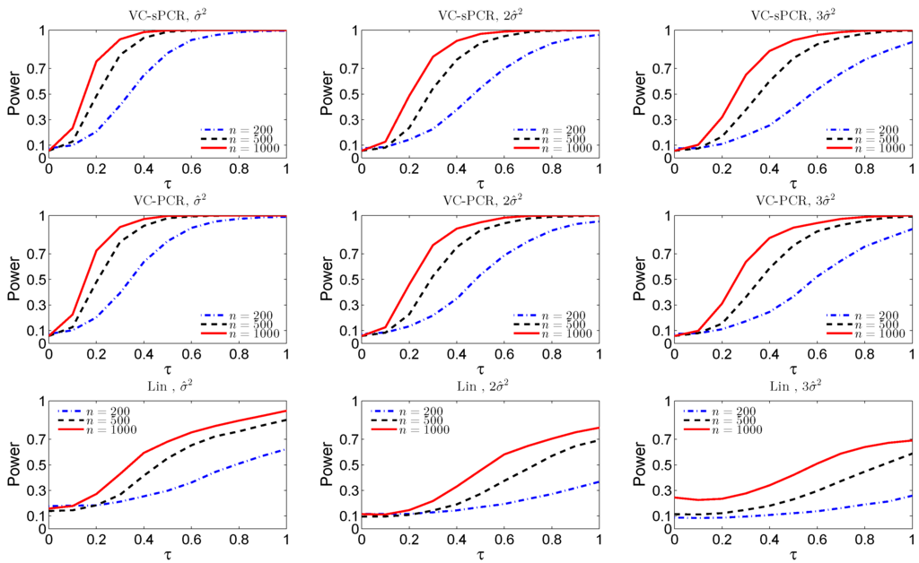 The empirical size and power functions of testing the overall genetic effect () fitted with the varying-coefficient sparse principal components regression VC-sPCR model (5) in the top row, with the VC-PCR model (3) in the middle row, and with the linear model (1) in the bottom row, under different sample sizes and error variances.