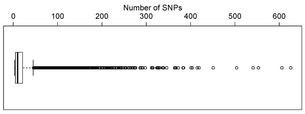 Boxplot of the number of single nucleotide polymorphisms (SNPs) in each gene.