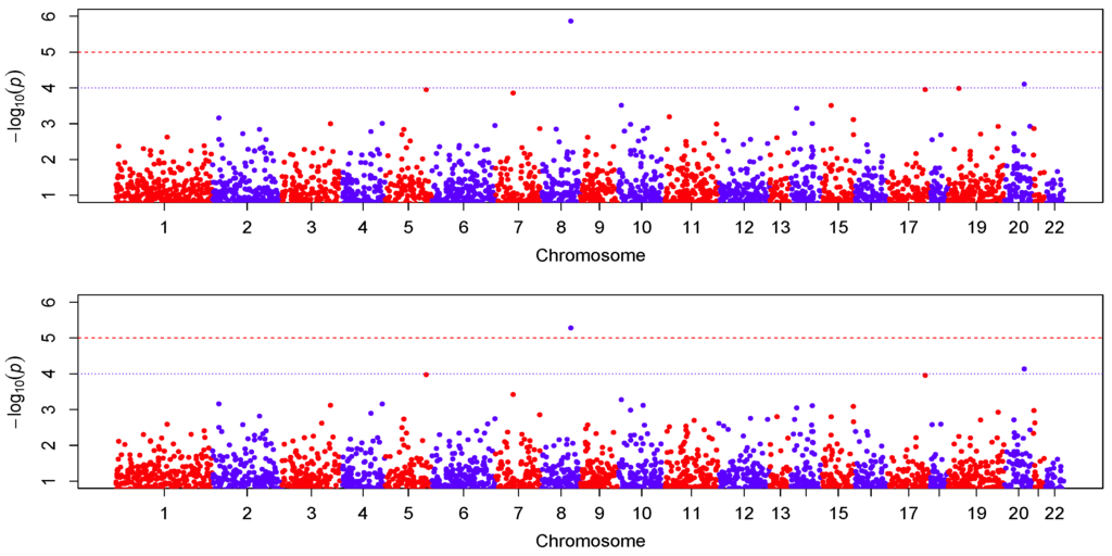 We centered the response first by subtracting the sample mean, then fitted the proposed varying-coefficient sparse PCR (VC-sPCR) model described in an earlier section to each gene, and conducted the aforementioned hypothesis testing. The number of PCs was chosen in such a way that >80% of gene variance can be explained by these PCs. As a comparison, we also fitted a regular varying-coefficient PCR (VC-PCR) model without assuming sparsity of the PC loadings. We first tested to assess the overall genetic effect. The corresponding p-values are denoted by for VC-PCR model and for VC-sPCR model (see Table 1). Figure 4 shows the Manhattan plot of the p-values for the two models. The top panel is for the results analyzed with the VC-PCR model, and the bottom panel is for the results analyzed with the VC-sPCR model. The vertical axis is the −log10(p-value) and horizontal axis shows the genes in 22 autosome chromosomes. The two models give quite consistent signals across all the genes. If we applied a Bonferroni threshold (−log10(0.05/12005) = 5.38) at a 0.05 genome-wide significance level, only one gene (ANGPT1) on chromosome 8 shows significance. If we lowered the threshold to 1 × , then one gene (NCOA5) on chromosome 20 shows suggestive significance. The QQ-plots of the p-values for the two models are given in Figure 5. As we can see that no obvious departure from the diagonal line is observed, indicating no inflation of the p-values.