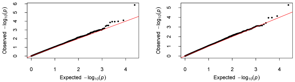 QQ-plot of the p-values. The left and right panel correspond to the result fitted with the VC-PCR and VC-sPCR model, respectively.