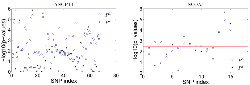 Plot of −log10(p-values) for testing the effect of total SNP effect () and the SNP×E interaction effect () in gene ANGPT1 (left panel) and NCOA5 (right panel).