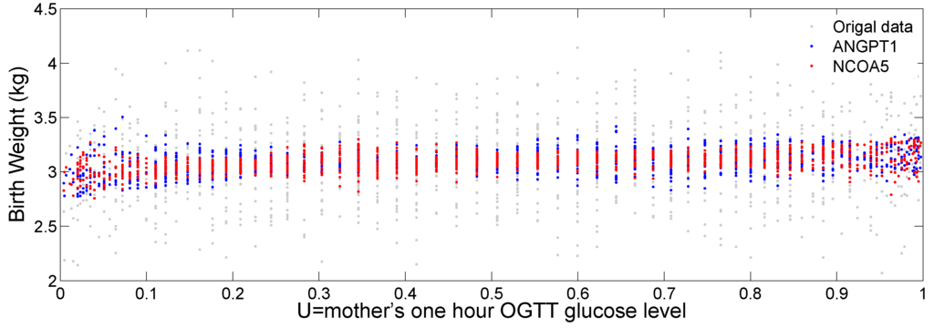 Figure 7 plots the original birth weight (grey dots), the fitted birth weight for gene ANGPT1 (blue dots) and NCOA5 (red dots) against the transformed glucose level (U). We can see a slightly increasing trend of fitted birth weight for the two genes as the mother’s glucose level increases. We can also see a varying pattern of the fitted values against U, indicating potential nonlinear interaction of the two genes with the mother’s glucose level to affect baby’s birth weight.