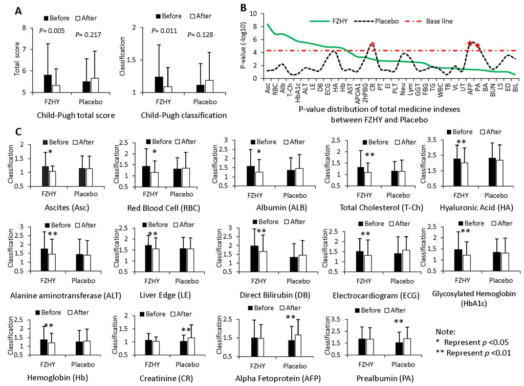 The clinical data analysis results between before and after treatment of Fuzheng-Huayu (FZHY) and placebo groups. (A) The Child–Pugh total score and classification comparison between FZHY and placebo groups; (B) the p-values’ distribution of medical indexes, which were tested using the random variance model of R package; (C) the expression levels of 14 significant medical indexes between FZHY and the placebo groups. To draw the figures conveniently, the detected value of each medical index was assigned a code (Arabic numerals); for example, 1 represents that the detected value is the normal level; 2 represents that the value is the abnormal level, but not worse; and 3 represents that the detected value is the abnormal level and worse.