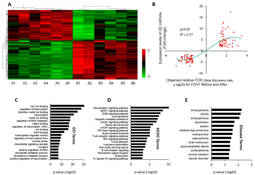 The bioinformatics analysis of miRNAs and target genes between before and after FZHY treatment for hepatitis B-caused cirrhosis (HBC) patients. (A) Heat-map of the differential expression of miRNAs between before and after FZHY treatment. Red color represents that the miRNA is upregulated, and green color represents downregulated. The relationship among the samples was divided by binary tree classification and is shown in the upper portion. The hierarchical cluster of miRNAs is displayed at the bottom; (B) The distribution of differential expressed (DE) miRNA expression levels; the right side represents the up-expressed miRNAs between before and after FZHY treatment; the left side represents the down-expressed miRNAs between before and after FZHY treatment; (C–E) MiRNA target genes related Gene ontology (GO) terms, Kyoto Encyclopedia of Genes and Genomes (KEGG) terms and disease terms.
