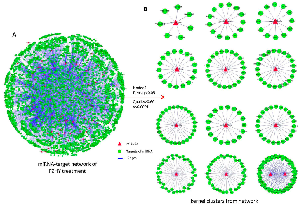 The miRNA-target network was constructed based on DE miRNAs and target genes, and the related clusters were identified using the ClusterONE algorithm. (A) The global profiles of the FZHY treatment-related miRNA-target network were built. The target genes of miRNAs were predicted using the TarBase (v7.0), miRecords and miRTarBase databases and the miRanda, miRDB, miRWalk and RNAhybrid prediction programs; (B) The kernel miRNA-related clusters isolated from the network using the ClusterONE algorithm, which was defined as node > 5, density > 0.05, quality > 0.60 and p < 0.0001. There are 12 clusters, containing 13 kernel miRNAs.
