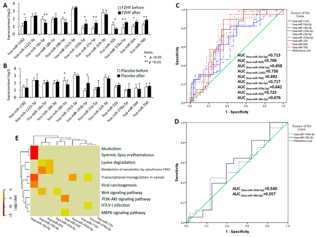 The potential kernel miRNAs were validated using the qPCR method. (A) Expression levels of 13 kernel miRNAs in the FZHY group. Illustrated p-values are based on pair-wise comparisons by the Mann–Whitney U-test. The result show that hsa-miR-1182, -18a-5p, -18b-5p, -193b-5p, -23a-5p, -326, -378a-5p, -564 and -760 (p < 0.05) have a statistically significant difference, while has-miR-1225-3p, -18b-3p, -1915-3p and -324-3p are insignificant between before and after trial; (B) Expression levels of 13 kernel miRNAs in the placebo group; hsa-miR-18b-5p and -193b-5p (p < 0.05) have significant differences between before and after trial. Illustrated p-values are based on pair-wise comparisons by the Mann–Whitney U-test; (C) Receiver operating characteristic (ROC) curves for hsa-miR-1182, -18a-5p, -18b-5p, -193b-5p, -23a-5p, -326, -378a-5p, -564 and -760 in the FZHY group; (D) ROC curves for hsa-miR-18b-5p and -193b-5p in the placebo group; (E) Hierarchical cluster and heat map of nine kernel miRNAs. The pathway analysis was performed using the miRPath program, and the significant pathways were determined when the p-value <0.001.