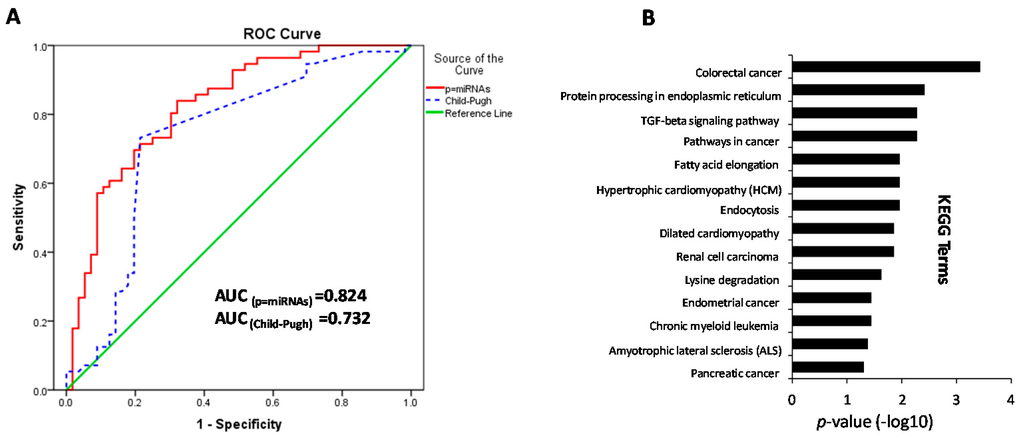 The KEGG terms of miRNA panel and the comparison of ROC between the miRNA panel and Child–Pugh. (A) ROC curves from the miRNA panel data and Child–Pugh data. ROC curve (p = miRNAs) generated using the miRNA expression data in the miRNA panel; the AUC was 0.824 (p = 0.000). The ROC curve of Child–Pugh was generated using the Child–Pugh score; the AUC was 0.732 (p = 0.000); (B) The miRNA combination of hsa-miR-18a-5p, -326, -1182 and -193b-5p associated with the KEGG pathway.