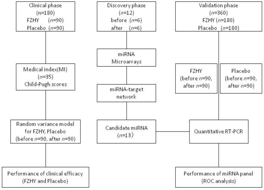 This study focuses on the identification of potential miRNA markers in HBC treatment progression with FZHY formula. At first, the multicenter, double-blind, equally-randomized and placebo-controlled trial was used to analyze the clinical efficacy of FZHY in HBC treatment. Morning fasting venous blood samples from 180 patients (90 cases with FZHY treatment and 90 cases with placebo treatment) were collected individually, which were used for medical indexes’ (MI, n = 35) detection. After 6 months of treatment, the same works were performed in these 180 cases. Secondly, 12 serum samples (6 pairs of before and after FZHY treatment) were used for miRNA microarray detection. The differentially-expressed miRNAs between before and after FZHY treatment were identified, and the miRNA-target network was constructed to identify the kernel miRNA markers. Lastly, 360 serum samples (FZHY before n = 90 and after n = 90; placebo before n = 90 and after n = 90) were used to validate the probability of potential miRNA markers in FZHY treatment of HBC patients (Figure 6). The serum samples were stored at −80 °C.