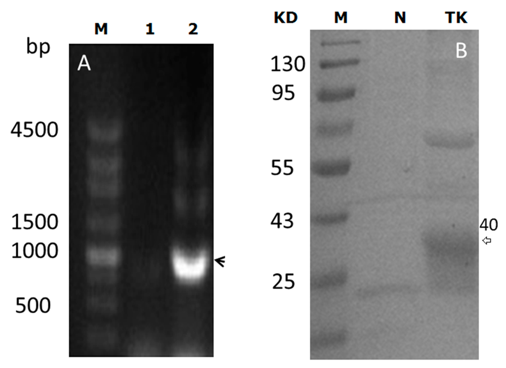 pBEX-tk was expressed in Bifidobacterium (BF). (A) PCR results. M: DNA standard molecule; lane 1: Negative control with pBEX template; lane 2: PCR product of tk with pBEX-tk template (black arrow); (B) polyacrylamide gel electrophoresis (PAGE) results. M: Protein standard molecule; lane N: Negative control of pBEX; lane TK: Purified TK expressed in pBEX-tk with His-tag (white arrow).