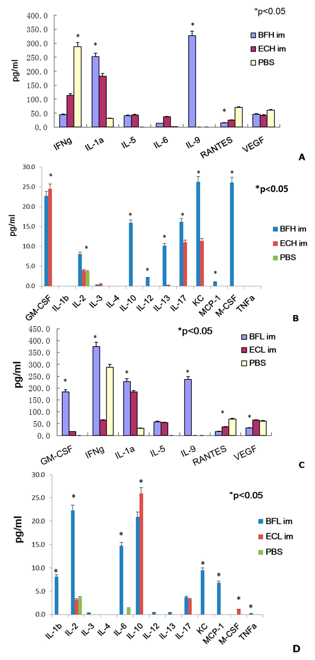 Comparing the cytokine profiles differentiation between BF-rTK and E. coli in BALB/c mice via intramuscular (IM) (n = 6). (A) Cytokine levels expressed in IM group with high dose of bacteria (1.0 × 106 cells/mL); (B) Cytokine levels expressed in IM group with high dose (1.0 × 106 cells/mL); (C) Cytokine levels expressed in IM group with low dose of bacteria (1.0 × 104 cells/mL); (D) Cytokine levels expressed in IM group with low dose of bacteria (1.0 × 104 cells/mL). BFH: BF-rTK with high dose (1.0 × 106 cells/mL); BFL: BF-rTK with low dose (1.0 × 104 cells/mL); ECH: E. coli with high dose (1.0 × 106 cells/mL); ECL: E. coli with low dose (1.0 × 104 cells/mL); im: intramuscular injection (* p < 0.05). PBS: phosphate buffer saline.