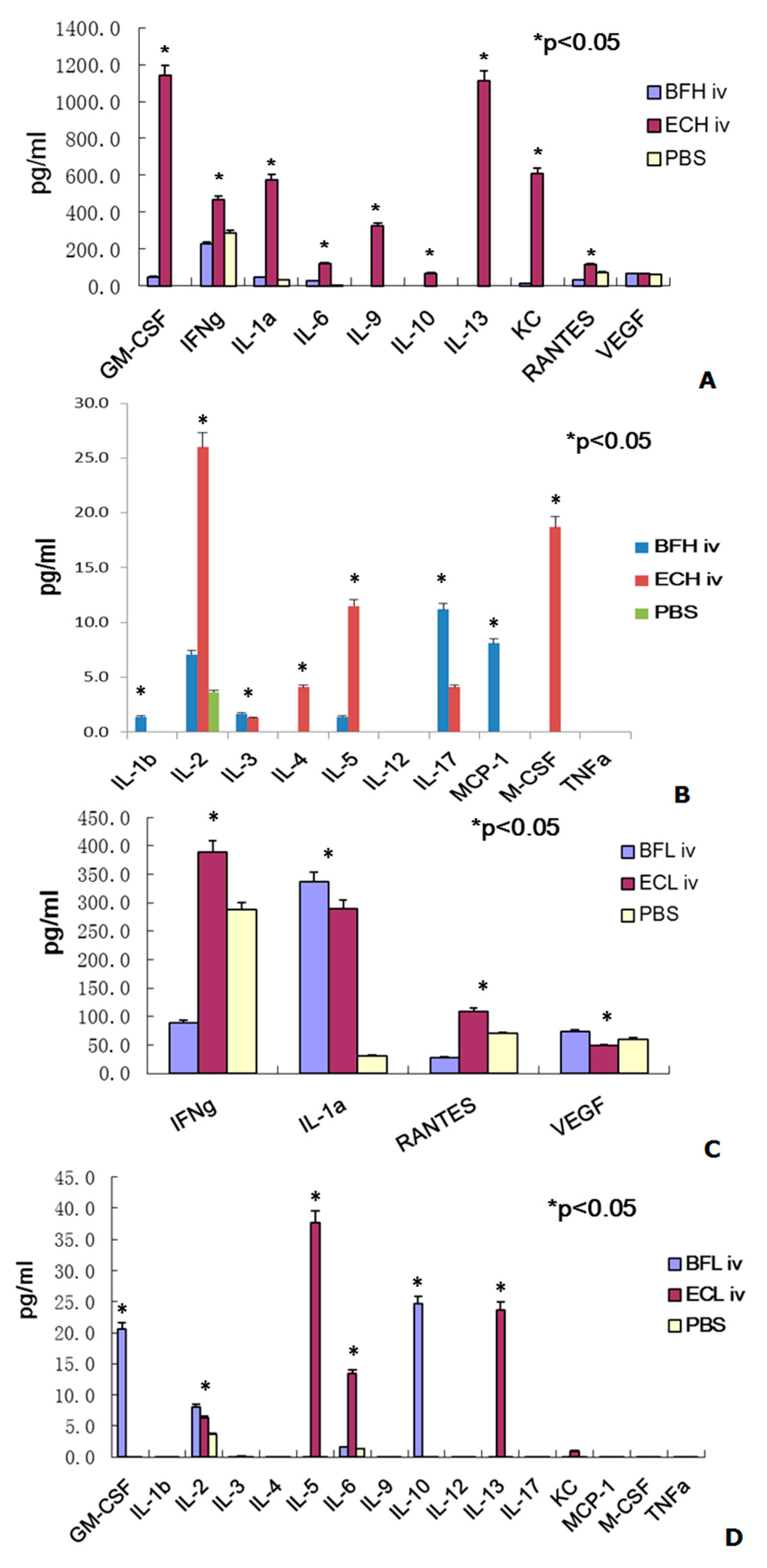 Comparing the cytokine profiles differentiation between BF-rTK and E. coli in BALB/c mice via intravenous (IV) (n = 6). (A) Cytokine levels expressed in IV group with high dose of bacteria (1.0 × 106 cells/mL); (B) Cytokine levels expressed in IV group with high dose of bacteria (1.0 × 106 cells/mL); (C) Cytokine levels expressed in IV group with low dose of bacteria (1.0 × 104 cells/mL); (D) Cytokine levels expressed in IV group with low dose of bacteria (1.0 × 104 cells/mL). BFH: BF-rTK with high dose (1.0 × 106 cells/mL); BFL: BF-rTK with low dose (1.0 × 104 cells/mL); ECH: E. coli with high dose (1.0 × 106 cells/mL); ECL: E. coli with low dose (1.0 × 104 cells/mL); iv: vein injection (* p < 0.05).
