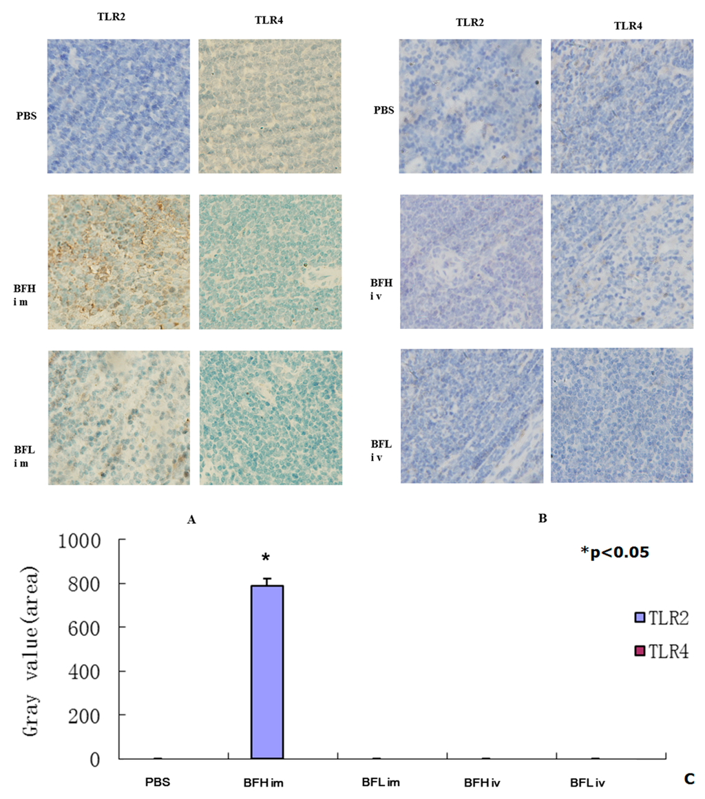 Immunohistochemical (IHC) assay of the spleen of BALB/c mouse via IM and IV treatment with BF-rTK (n = 6). (A) IM injection of a high dose of BF-rTK induced TLR2 significantly increased expression and TLR4 had no detectable variation; (B) TLR2 and TLR4 were undetectable treated with BF-rTK via IV with both high and lower doses of BF-rTKs. The slices were detected three times with duplicate technical replicates; (C) Quantitative analysis of TLRs (* p < 0.05).