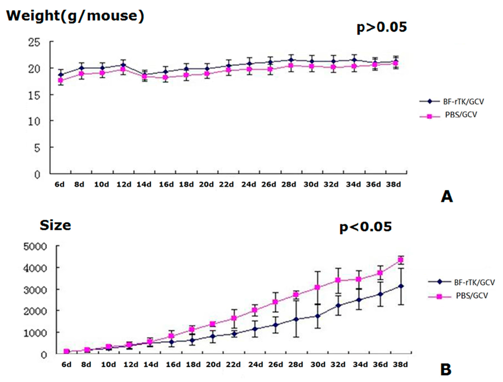 BF-rTK/GCV treatment significantly inhibits tumor growth in vivo. (A) Body weight curve of nude mice treated by BF-rTK/GCV or PBS/GCV (p > 0.05; n = 5); (B) Tumor growth of nude mice treated by BF-rTK/GCV or PBS/GCV (p < 0.05; n = 5). The tumor size was calculated as follows: V = 1/2AB2 (V: tumor size, A: tumor long diameter, B: tumor short diameter).
