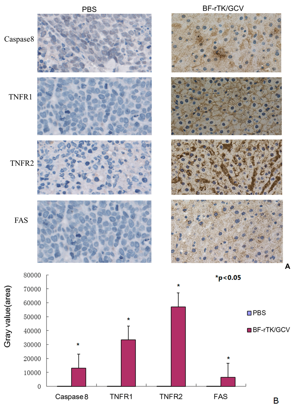 IHC of active caspase 8 (apoptosis-related cysteine peptidase) and death receptors (TNFR1, TNFR2 and FAS) were performed on a gastric tumor tissues treated by PBS/GCV and BF-rTK/GCV, respectively. Retrieved tissues were fixed, decalcified in 10% formalin and embedded in paraffin 24 h posttreatment. Serial sections of the embedded specimens were stained with hematoxylin and eosin (H & E). The fixed tissues of colo320 intestinal tumor were blocked and incubated with caspase 8 (P18) antibody (BA2143-2, Boster, Wuhan, China), and caspase 3 (P12) antibody (BA3592, Boster), The fixed tissues of MKN-45 gastric cancer tumor colo320 intestinal tumor were blocked and incubated with caspase 8 (P18) antibody (BA2143-2, Boster), TNFR1 antibody (BA4891), TNFR2 antibody (BA1438) and FAS antibody (BA0048-1). After being washed, tissues were incubated with biotin-labeled secondary antibody for 30 min, followed by incubating cells with streptavidin-HRP conjugate for 20 min at room temperature (RT). The presence of the expected protein was visualized by diaminobenzidine (DAB) staining and examined under a microscope. Stains with control IgG were used as negative controls.