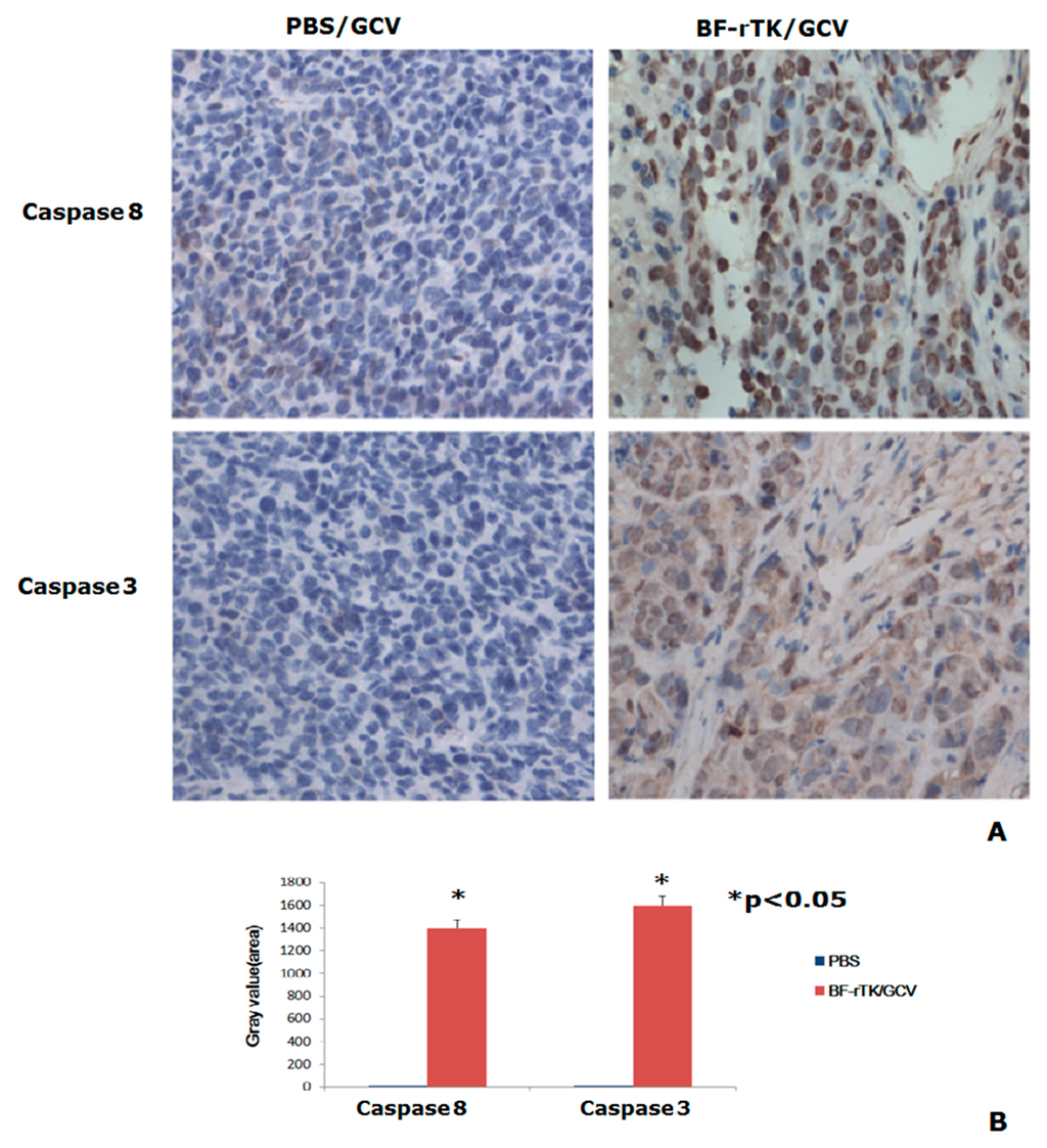 IHC assay of the intestinal cancer colo320 xenograft sample from nude mice treated by BF-rTK/GCV (n = 3). (A) The tumor tissue samples were from intestinal cancer colo320 cells treated by PBS/GCV, and BF-rTK/GCV, respectively. The caspase 8 and caspase 3 levels were analyzed with IHC; (B) Quantitative analysis of caspase 8 and caspase 3 (* p < 0.05).
