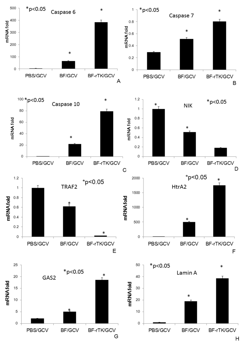 Caspase 8-related apoptosis genes are enriched in rTK gene induced apoptosis. (A–H) Xenograft tumor tissues treated by PBS/GCV, BF/GCV and BF-rTK/GCV were collected and RNA was extracted from tumor tissues (n = 3). Gene expression of caspase 6 (A), caspase 7 (B), caspase 10 (C), NIK (D), TRAF2 (E), HTRA2 (F), GAS2 (G), and Lamin A (H) were analyzed by qRT-PCR using specific primers. All values were normalized to glyceraldehyde-3-phosphate dehydrogenase (GAPDH) as an internal control and were expressed relative to tumors treated with GCV in each case (* p < 0.05).