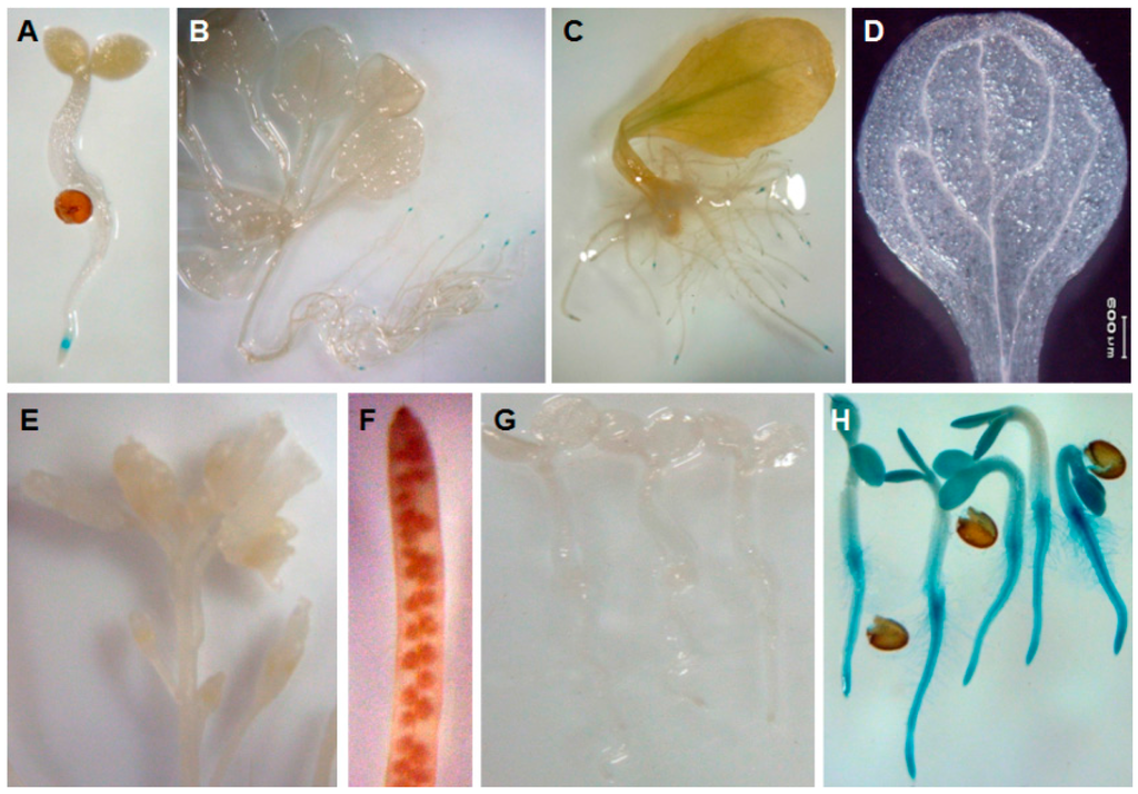 - Jefferson, R.A.; Kavanagh, T.A.; Bevan, M.W. Gus fusions: β-glucuronidase as a sensitive and versatile gene fusion marker in higher plants. EMBO J. 1987, 6, 3901–3907. [Google Scholar] [PubMed]