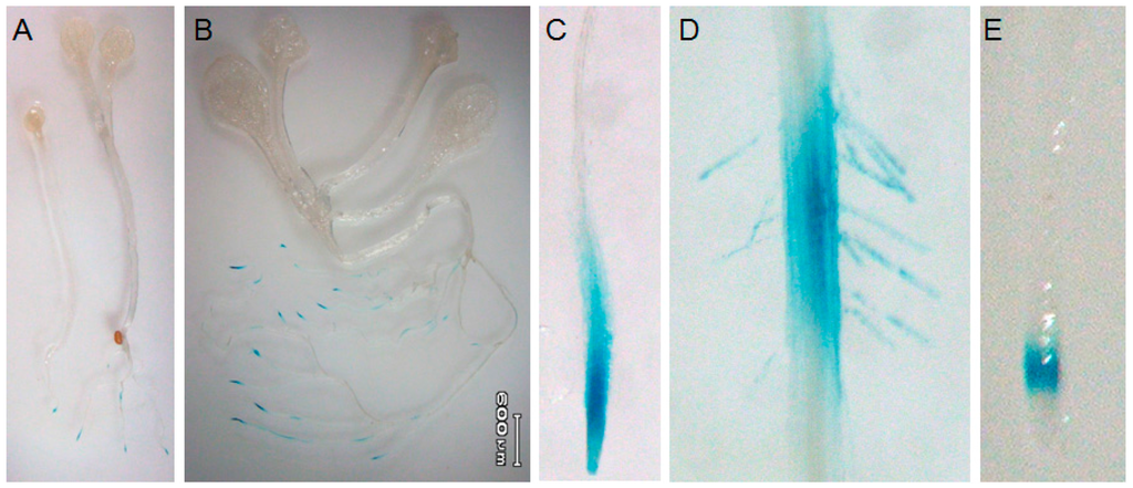 AtTGG4 and AtTGG5 have been found to be root specific long ago [23], and their recombinant proteins over-expressed in Pichia pastoris had different catalytic properties compared to the MYR I myrosinases AtTGG1 and AtTGG2 [24]. However, their root-tip-specific expression and biological function in plants was unknown. Analysis of the expression pattern of a gene has been widely used as an important method to deduce its biological function. We firstly studied the expression pattern of the myrosinase gene family in A. thaliana by RT-PCR, and confirmed the results in previous reports [23,25,33] (Figure 1). To further characterize the expression pattern of AtTGG4 and AtTGG5, we fused their promoters with the GUS reporter gene and transformed Col-0. GUS staining revealed that AtTGG4 and AtTGG5 were all predominantly expressed in root-tips with differences. AtTGG4 was only expressed in the elongation zone of all types of roots (Figure 2), while AtTGG5 was expressed in the whole root-tip, including the cap zone, the division zone, the elongation zone, and some hairy zones (Figure 3). However, the most densely expressed region for AtTGG5 was still the elongation zone. It was the first time the root-tip specific expression for AtTGG4 and AtTGG5 and their involvement in the regulation of root growth was reported.