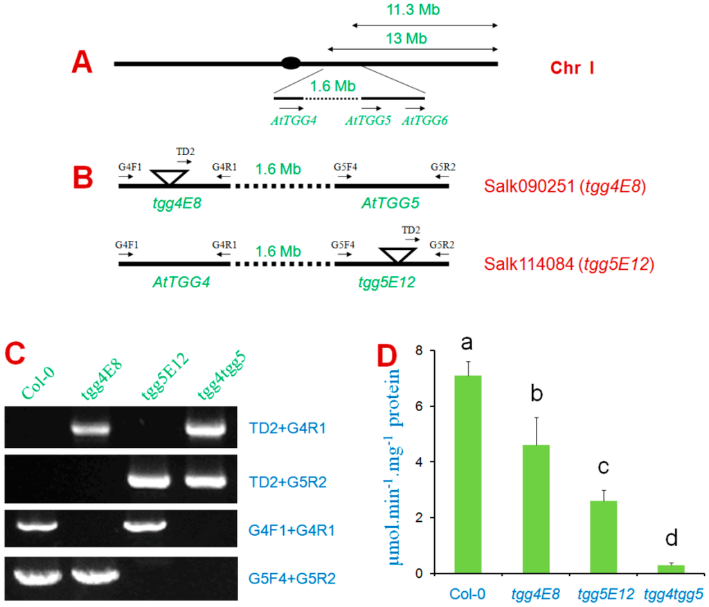 Knock-out mutations are widely used to study the biological functions of genes. AtTGG4 and AtTGG5 are closely linked in Chromosome I of A. thaliana with a distance of 1.6 Mb (Figure 4A). To study the biological function of AtTGG4 and AtTGG5, two T-DNA insertion lines were obtained from the Arabidopsis Biological Resource Center (ABRC). The flanking regions of the T-DNA were PCR amplified with a T-DNA specific primer and gene specific primers as shown in Figure 4B. The fragments were sequenced to determine the accurate position of T-DNA insertion. Mutant line Salk090251 contained a T-DNA insertion at +1650 (from start codon) in exon 8 of AtTGG4 and, thus, designated as tgg4E8 hereafter. Mutant line Salk114084 contained a T-DNA insertion at +2455 (from start codon) in exon 12 of AtTGG5, thus designated as tgg5E12 hereafter.