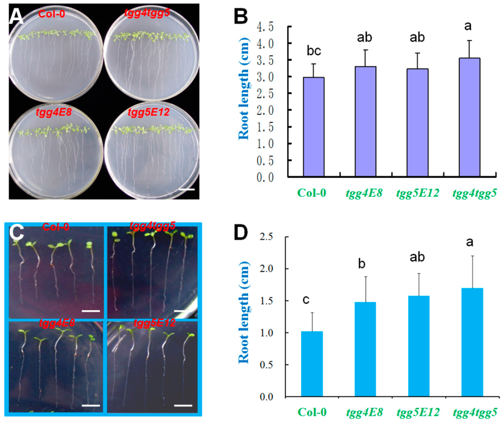 Root growth of AtTGG4 and AtTGG5 mutants on Murashiege & Skoog (MS) medium (A,B) and in soil with sufficient water (C,D). (A) Representative plates of four genotypes grown on MS medium for two weeks; scale bar represents 1 cm; (B) analysis of root lengths grown on MS medium; different letters above the columns indicate significant difference at 5% significant level; (C) representative seedlings of four genotypes grown in soil for two weeks after sowing; scale bars represent 5 mm; and (D) analysis of root lengths grown in soil; different letters indicate significant difference at 5% significant level.