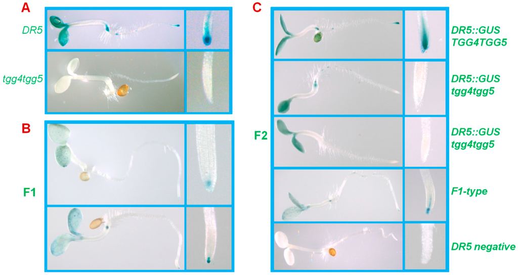 To test the involvement of AtTGG4 and AtTGG5 in auxin biosynthesis, the well characterized DR5::GUS gene was used as an auxin indicator [32]. A DR5 line containing the DR5::GUS gene was cross-pollinated with tgg4tgg5. GUS-staining results revealed that DR5::GUS was primarily expressed in cotyledons, root-tips, the hypocotyl-root junctions of the DR5 parent line, and the expression in root-tips were centered at the cap region (Figure 6A). The DR5::GUS expression level in the F1 generation was lowered down in both cotyledons and root-tips due to the half dosage of DR5::GUS, AtTGG4, and AtTGG5 genes (Figure 6B). In the F2 segregating generation, expression patterns similar to parents and F1 were identified. The plants that showed similar expression levels to DR5 in cotyledons, but lower or undetectable GUS expression in root-tips were also identified (Figure 6C), the genotype of these plants were DR5::GUS/tgg4tgg5 (Figure 6C). Therefore, we concluded that AtTGG4 and AtTGG5 played a major role in auxin biosynthesis in root-tips.