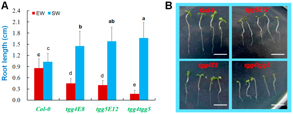 Root growth of AtTGG4 and AtTGG5 mutants in soil with excessive water. (A) Analysis of root length grown in soil with excessive water (EW) and sufficient water (SW) for two weeks after sowing; different letters above columns indicate significance at 5% significant level; and (B) representative seedlings of the four genotypes grown in soil with excessive water for two weeks after sowing; scale bars represent 5 mm.