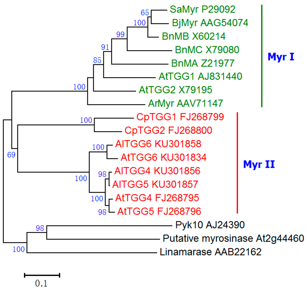 AtTGG4 and AtTGG5 were the first found Myr II genes [23,24], and their myrosinase activities of the recombinant proteins were confirmed by over-expressing the genes in Pichia [24]. Another member AtTGG6 in A. thaliana was previously considered as a pseudogene due to several frame-shift mutations [25], but it was specifically expressed in anthers, similar to AtTGG3, another myrosinase pseudogene in A. thaliana [26]. However, functional alleles of AtTGG6 were identified in some A. thaliana ecotypes recently [27].