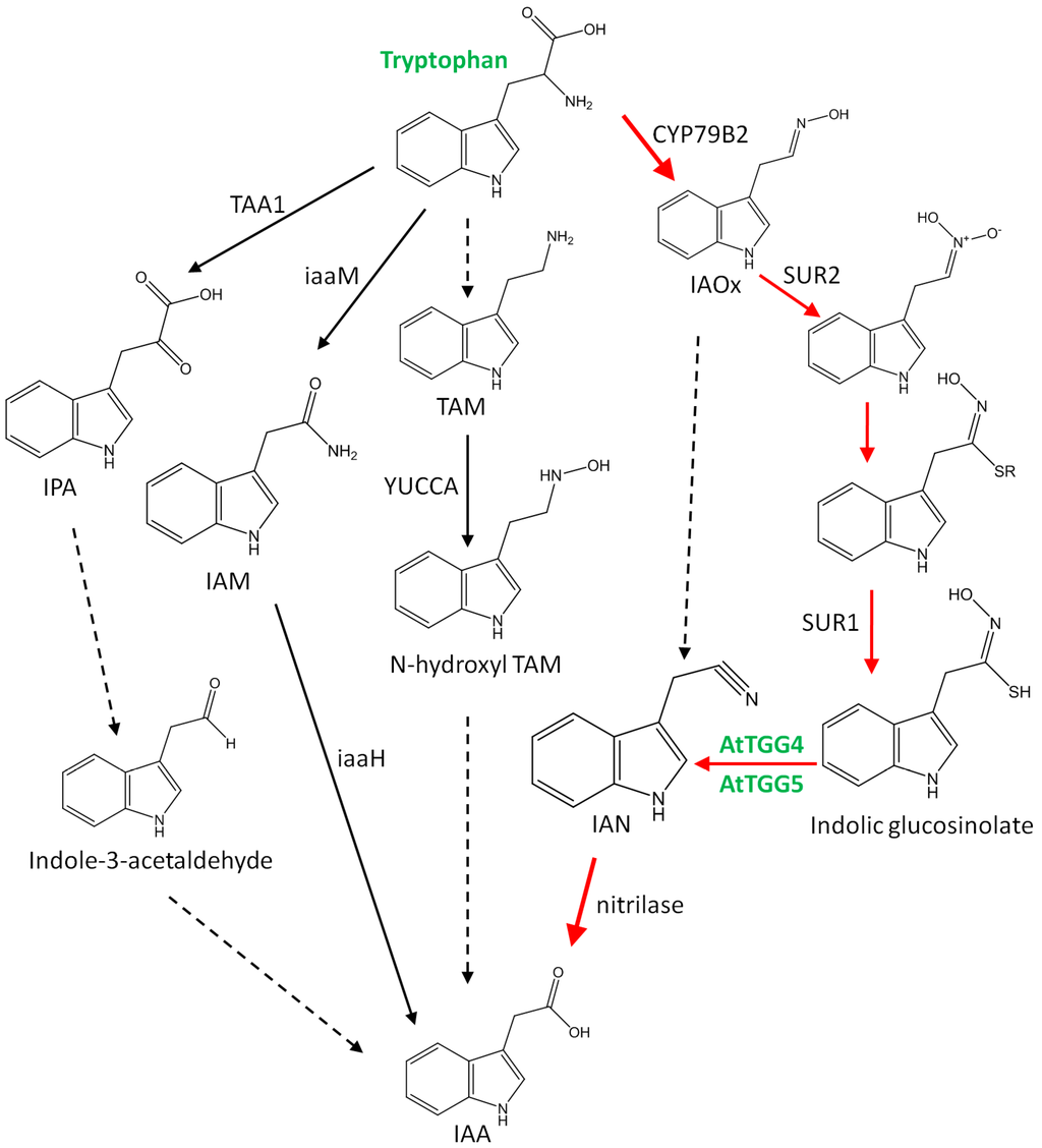 A model of the tryptophan-dependent auxin biosynthetic pathways. Modified from Zhao et al. [43]. The pathway that AtTGG4 and AtTGG5 are involved in is shown in red. Solid arrows indicate that the enzymes catalyzing the steps have been identified; Dashed arrows indicate proposed steps, in which enzymes catalyzing the steps have not been determined conclusively. TAM, tryptamine; IAOx, indole-3-acetaldoxime; IPA, indole-3-pyruvate; IAM, indole-3-acetamide; IAN, indole-3-acetonitrile; TGG, thioglucoside glucohydrolase (AtTGG4, AtTGG5).