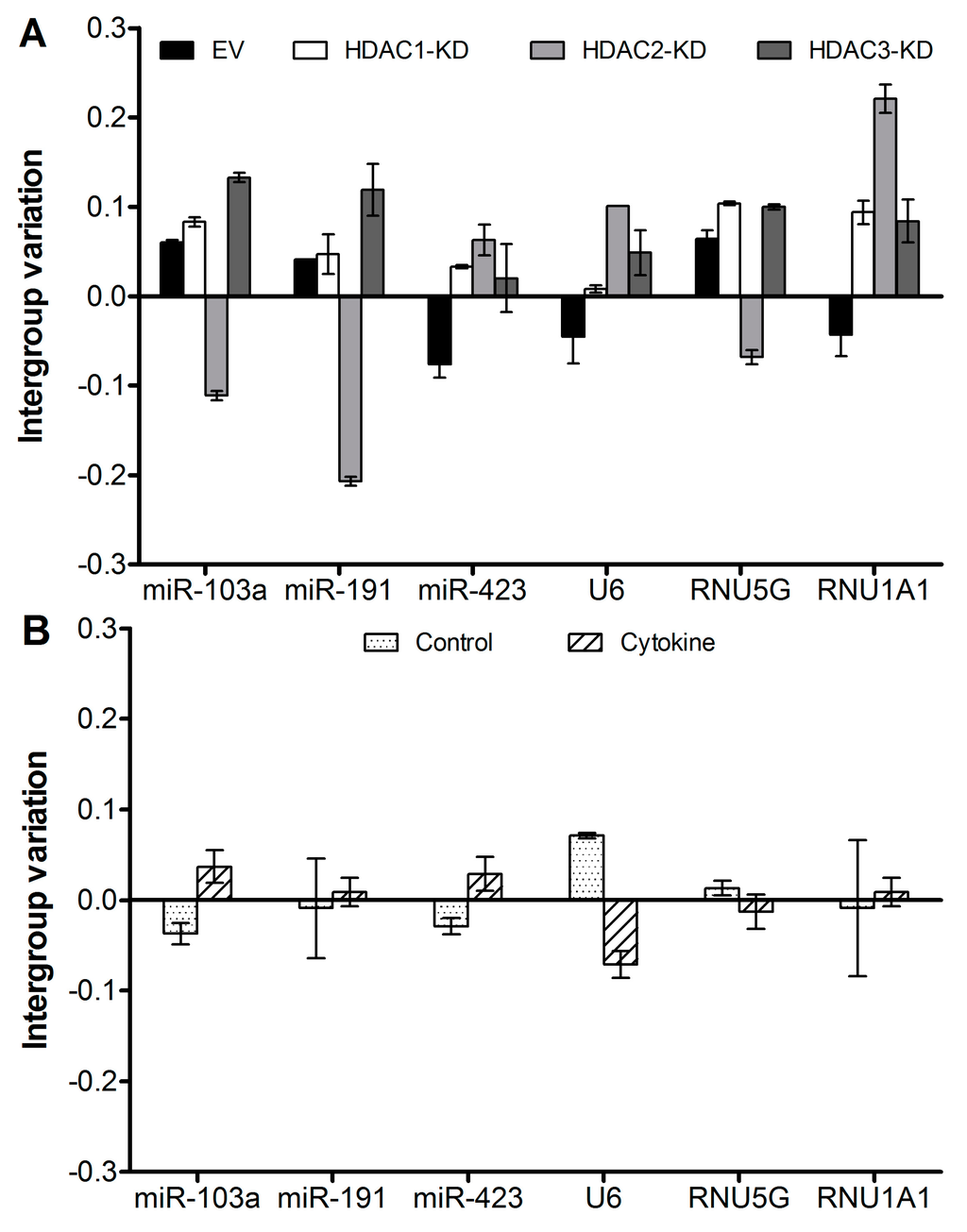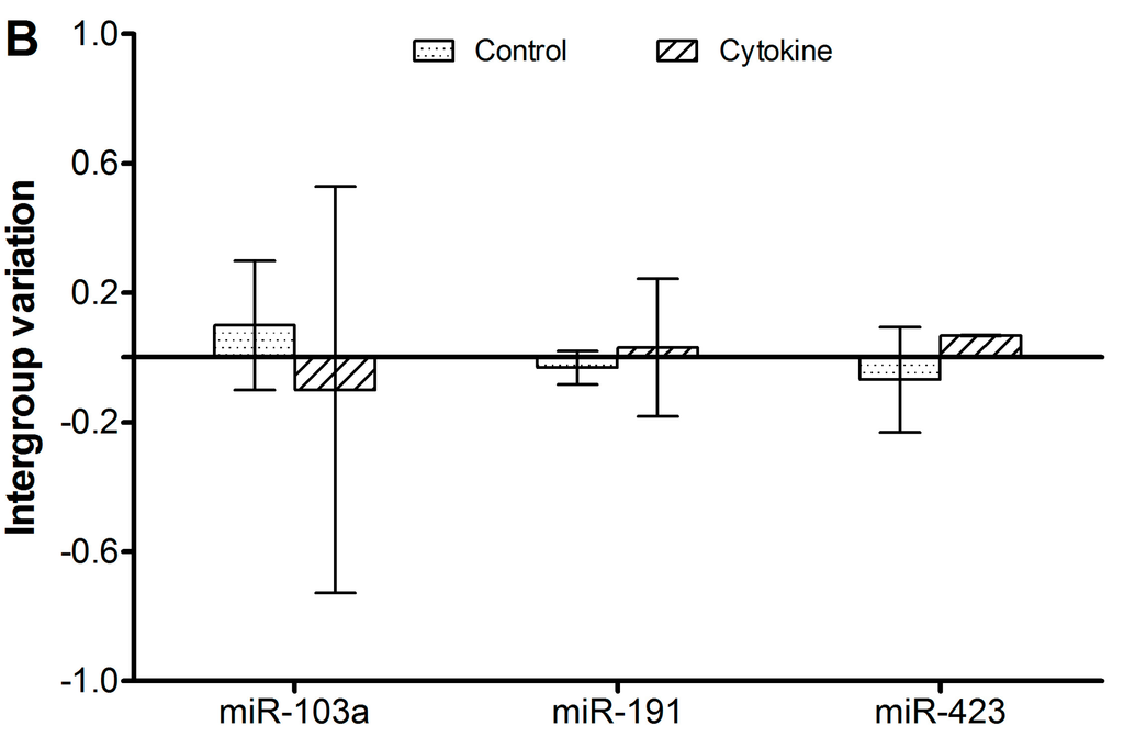 Intergroup variation of three reference miRs quantified by qPCR. Intragroup variation is given as error bars. One sample from each of the four cell lines were exposed to cytokines for 6–24 h or control medium. RNA was purified, and samples were analyzed by qPCR. In total, 24 samples were analyzed by NormFinder, divided by cell line into four groups of 6n (A) or by exposure into two groups of 12n (B).
