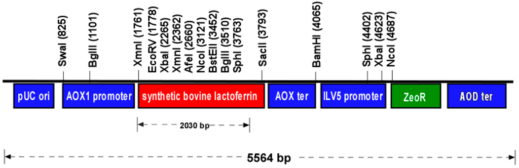 The vector pJ902sbLf (Figure 1) encodes for the bLf with optimized codon usage for P. pastoris expression; it contains a selectable marker which confers Zeocin resistance. The synthetic bovine lactoferrin (sbLf) gene is derived from a bLf gene (GenBank accession No. EU812318) cloned by García-Montoya et al. [15] and is under the control of the AOX1 promoter. Alkaline lysis extraction and digestion of the synthetic plasmid pJ902sbLf by BamHI produced a linearized DNA fragment that measured 5564 bp in length.