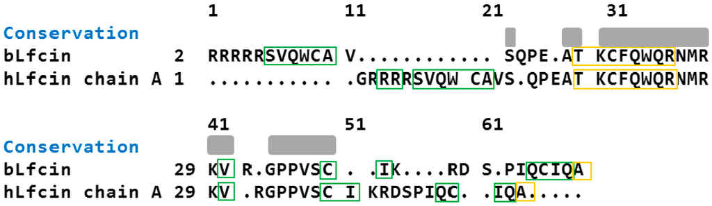 Comparison of bovine and human Lfcin moiety. Upper gray box represents amino acid identity. Green boxes represents beta sheet and yellow box represent alfa sheet structure homology.
