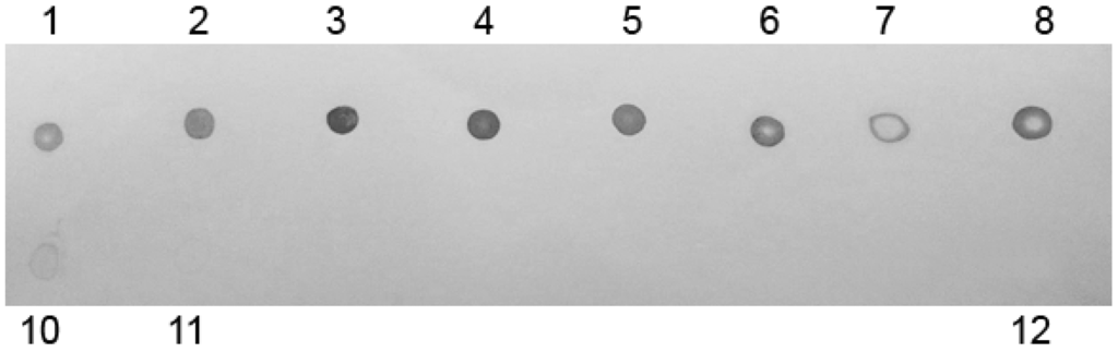 Dot-immunoblotting analyses of recombinant bovine lactoferrin (rbLf) from induced clones. Following 72 h of induction, proteins were harvested from supernatant and were spotted in a polyvinylidene difluoride (PVDF) membrane. Lanes 1–8: protein samples of each clone; Lane 10: commercial bovine lactoferrin (bLf) (0.5 mg/mL); Lane 11: commercial bLf (0.05 mg/mL); Lane 12: protein extracts from native P. pastoris.