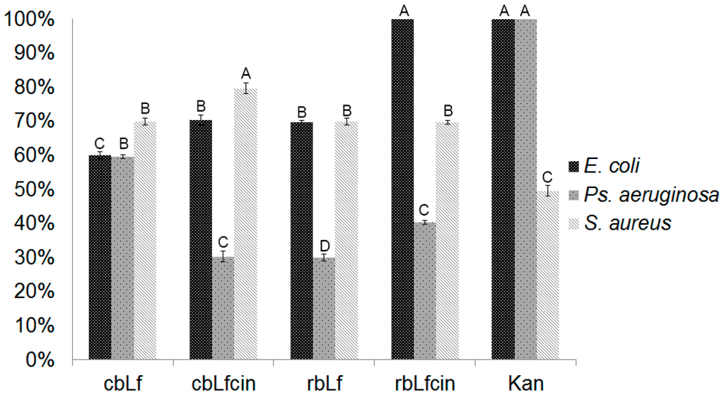 Antibacterial activity of rbLf. Bacterium were incubated in Luria-Bertani (LB) broth and treated with 5.0 ng/mL. Inhibition growth percentage was calculated relative to commercial bLf and commercial antibiotics. cbLf = commercial bovine lactoferrin; cbLfcin = commercial bovine lactoferricin; rbLf = recombinant bovine lactoferrin. rbLfcin = recombinant bovine lactoferricin; Kan = kanamycin. Group A belongs to treatment with highest percentage of inhibition, while group D belongs to treatment with lowest inhibition. Groups B and C are intermediate, however they are statistically different.