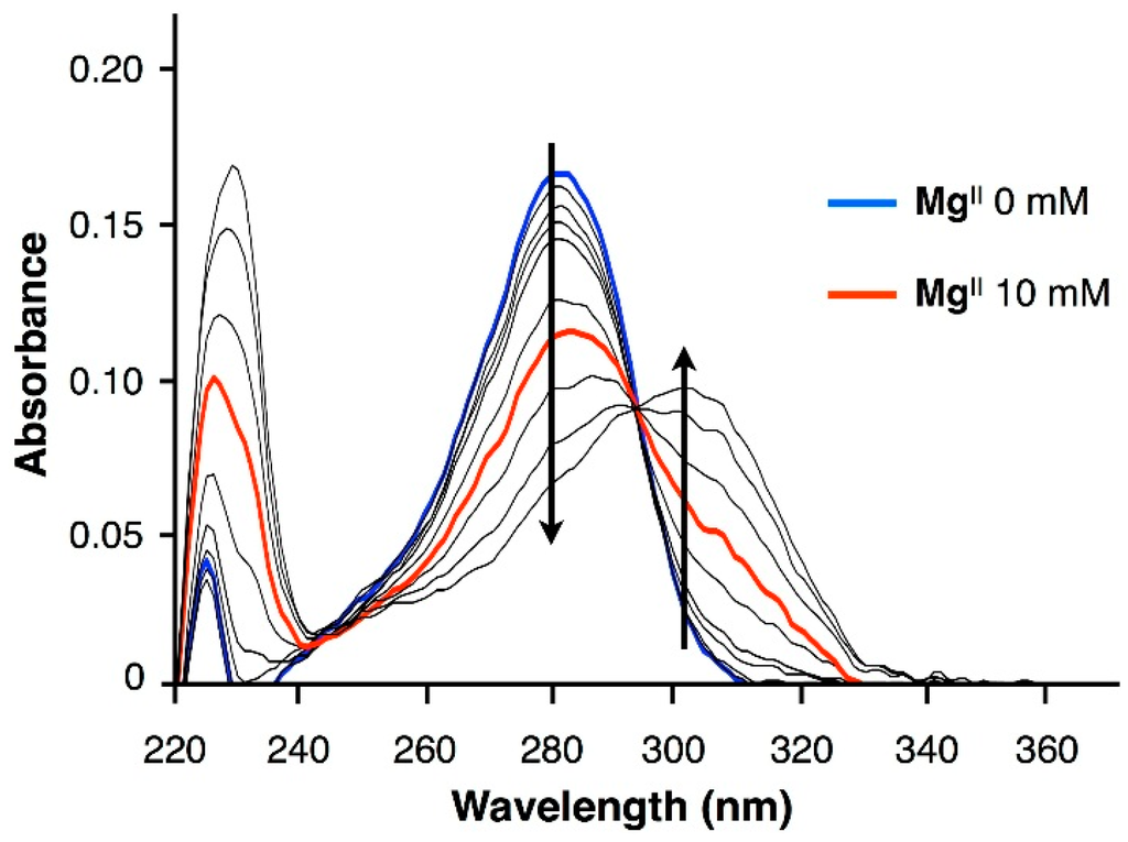 Ultraviolet-visible (UV) spectral changes of hydroxypyridone-bearing nucleoside triphosphate (dHTP) at various concentrations of MgII ions. dHTP: 100 µM, MgII: 0, 0.1, 0.5, 1.0, 2.0, 5.0, 10, 20, 50, and 100 mM, in 25 mM MOPS (3-(N-morpholino)propanesulfonic acid) buffer (pH = 7.0), l = 0.1 cm, at room temperature. Blue line: 0 mM, red line: 10 mM, black lines: 0.1, 0.5, 1.0, 2.0, 5.0, 20, 50, and 100 mM. Arrows indicate the changes in the absorbance upon increasing the MgII concentration.