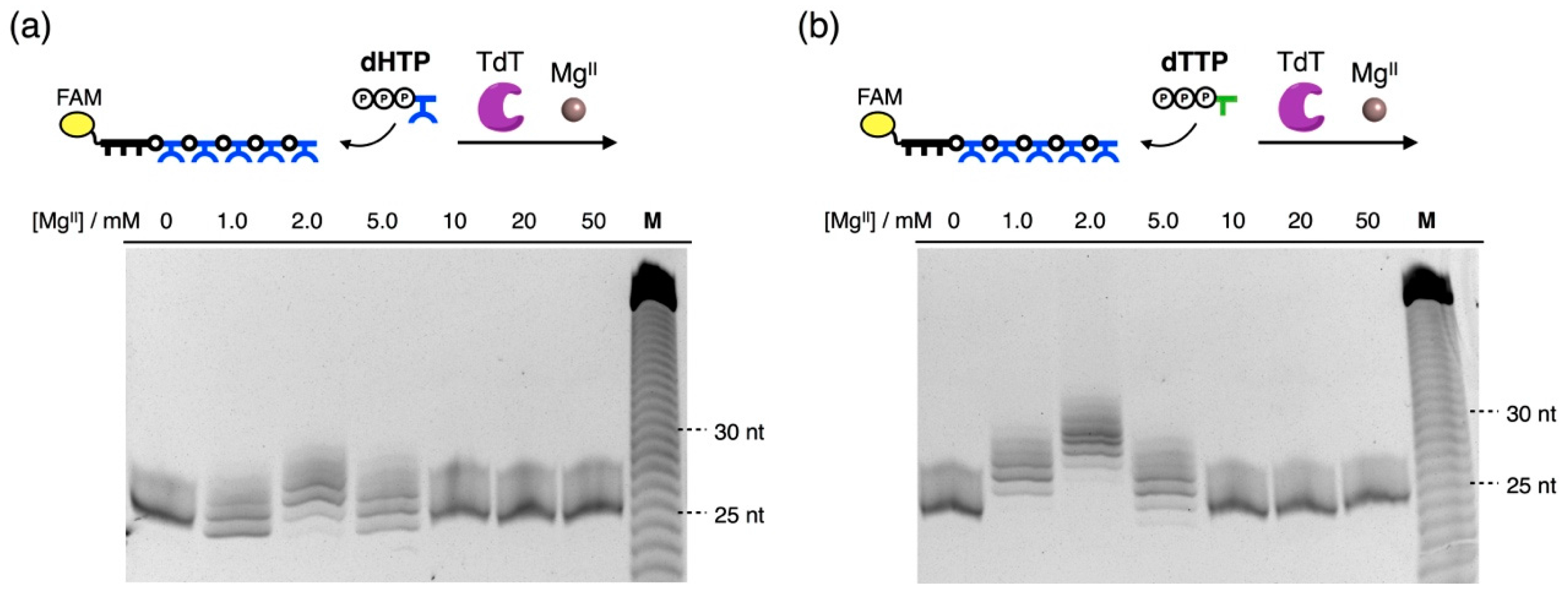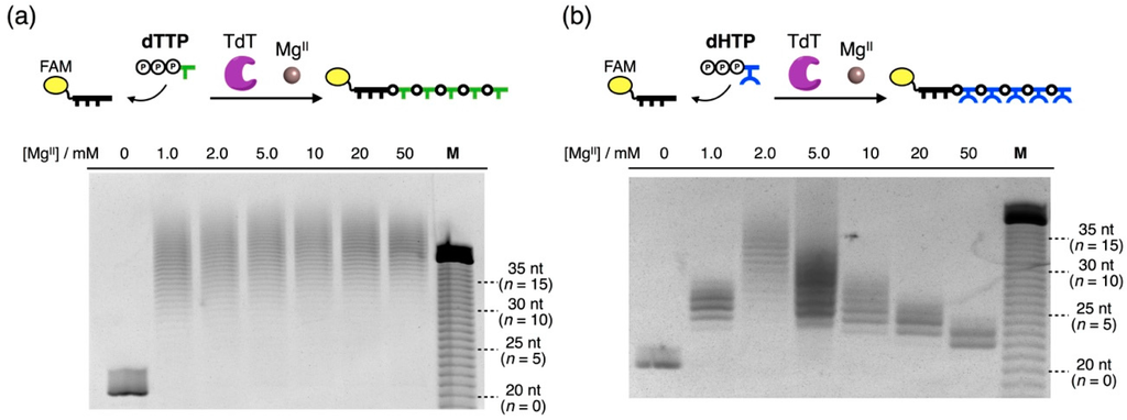 Next, we investigated the effects of MgII ions on the enzymatic reaction by varying the concentrations of MgII ions (0 to 50 mM) in the reaction buffer. A fluorescein (FAM)-labeled DNA primer (5′-FAM-dT20-3′, 5.0 µM) was incubated with 20 equivalents of natural thymidine triphosphate (dTTP) or artificial hydroxypyridone-bearing nucleoside triphosphate (dHTP) in the presence of TdT (2 U/µL). After 24-h incubation at 37 °C, the reaction products were analyzed by denaturing polyacrylamide gel electrophoresis (PAGE) (Figure 2). In the absence of MgII ions, only the primer strand was observed on the gel, showing that neither dTTP nor dHTP was appended to the primer by the enzyme. This result corroborated the fact that TdT requires MgII ions as a cofactor for its enzymatic activity [26,27,28].