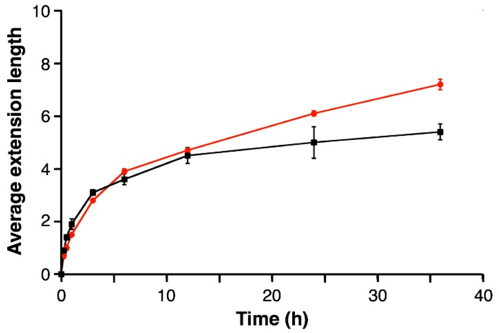 The time-course analysis of the polymerization reaction was performed by initiating the reaction as described in Section 3.3. An aliquot of the reaction mixture was taken for PAGE analysis at defined time points. After quenching the reaction, the samples were stored at −20 °C until the time course was completed. Denaturing PAGE was then carried out and the average extension length was estimated based on the intensity of the bands on the gel. Averages of at least three independent experiments are plotted in the figure.