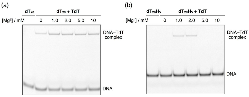 Effects of MgII concentrations on the binding of TdT with (a) natural DNA primers (5’-FAM-dT20-3′) and (b) artificial ligand-bearing DNA primers (5′-FAM-dT20H5-3′). EMSA was performed using an EDTA-free buffer at 10–15 °C. 5′-FAM-dT20-3′ or 5′-FAM-dT20H5-3′: 5.0 µM, TdT: 2 U/µL, MgCl2: 0, 1.0, 2.0, 5.0 and 10 mM.