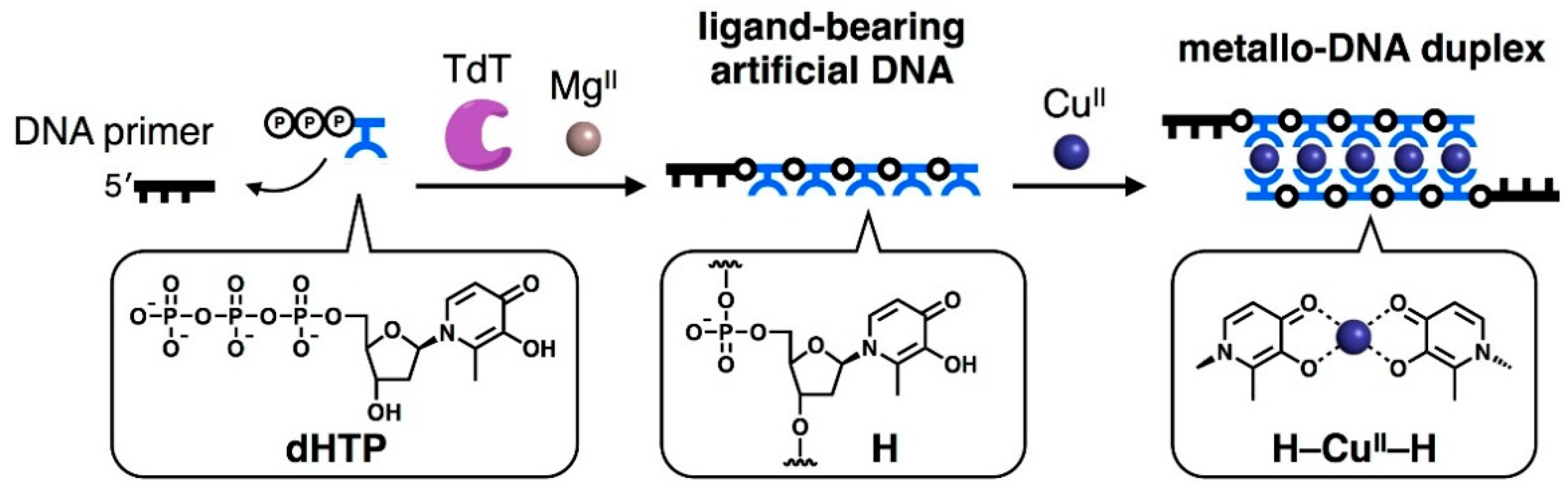 In these earlier studies, ligand-bearing nucleotides were incorporated into DNA strands based on the standard solid-phase phosphoramidite chemistry. We have recently developed a method to synthesize artificial ligand-bearing DNA strands via an enzymatic polymerization reaction [24]. Enzymatic DNA synthesis is widely utilized in chemical biology as well as in DNA-based materials science [25]. Thus, polymerase synthesis of ligand-bearing artificial DNAs is expected to greatly expand the future applications of the metal-mediated base pairing system. The synthetic scheme we have developed is depicted in Scheme 1. The triphosphate derivative of the hydroxypyridone-bearing nucleoside (dHTP) is oligomerized to afford ligand-bearing artificial DNA strands, which are subsequently subjected to metal-mediated base pairing. We utilized a template-independent DNA polymerase, terminal deoxynucleotidyl transferase (TdT) [26,27,28], because it is known to accept not only natural deoxynucleoside triphosphates (dNTPs) but also modified and unnatural nucleoside triphosphates [29,30,31,32]. We found that TdT catalyzed the polymerization of dHTP, and DNA primers were successfully tailed with several H nucleotides. The resulting H-tailed strands formed metallo-DNA duplex structures through the formation of H–CuII–H base pairs, which was confirmed by ultraviolet-visible (UV) spectroscopy and polyacrylamide gel electrophoresis (PAGE) [24].