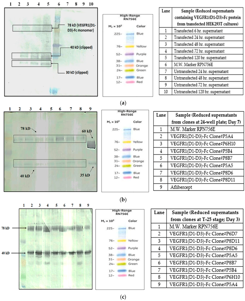 It is known that one of the reasons for clipping of Fc fusion proteins is a result of the action of proteases secreted by host cells harboring the gene of interest []. In order to find out whether proteolysis is dependent on the type of host cell, VEGFR1(D1–D3)-Fc recombinant gene was transfected in two different mammalian cell lines, HEK293T, and CHOK1SV GS-KO. HEK293T cells were transiently transfected with a plasmid containing VEGFR1(D1–D3)-Fc using lipofectamine™ 2000 (Life Technologies, Carlsbad, CA, USA) as the transfection agent, whereas CHOK1SV GS-KO cells were stably transfected by electroporation. VEGFR1(D1–D3)-Fc yielding CHOK1SV GS-KO clones were propagated through various stages of development by passaging from 96-well plate through a 24-well plate, T-25, T-75, T-175 flasks and a roller bottle. Western blot analyses were performed at every stage of clone development in order to check for expression levels of the protein under both reducing and non-reducing conditions (Figure 1a–d).