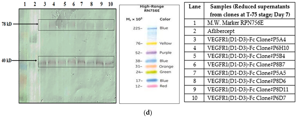 (a) Western Blot of supernatants of transfected HEK293T cells expressing VEGFR1(D1-D3)-Fc protein at different time points in 24-well plate; (b) Western Blot for VEGFR1-Fc detection in supernatants of transfected CHOK1SV GS-KO clones at 24-well plate stage of clone development; (c) Western Blot of supernatants of clones at T-25 stage for VEGFR1(D1–D3)-Fc protein expression analysis; (d) Western Blot of supernatants of clones at T-75 stage for VEGFR1(D1–D3)-Fc protein expression analysis.