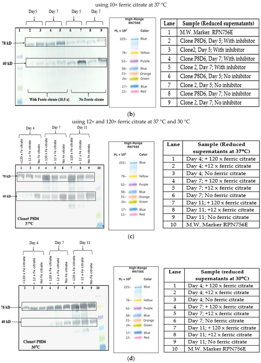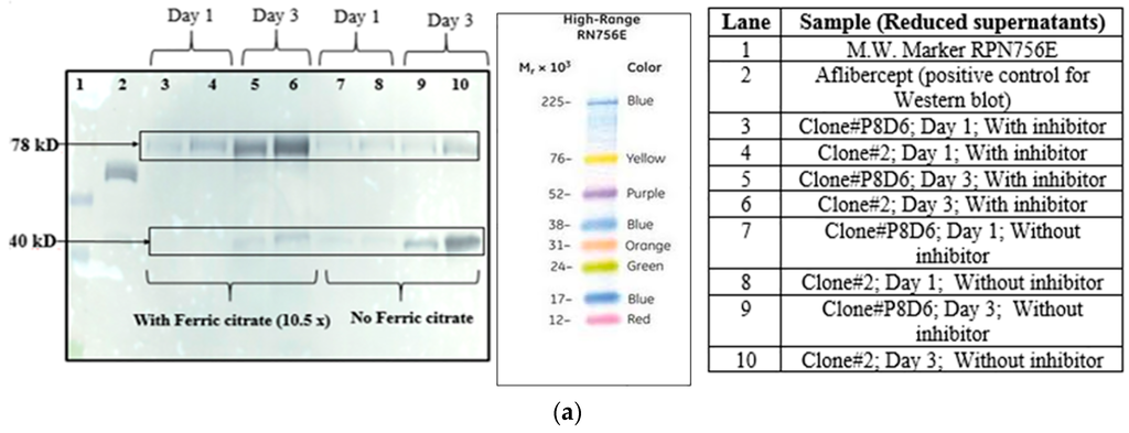 Two VEGFR1-Fc clones (clones 2 and P8D6) were cultured in the presence of 10× ferric citrate in CDCHO media at 37 °C and 5% CO2. Western blots were performed with culture supernatants collected on different days and checked for degradation profile of protein in presence and absence of inhibitor for both clones (Figure 2b). The effect of a higher concentration of ferric citrate (120×) and at a lower culture temperature was even more pronounced (Lane 10; Figure 2c,d).