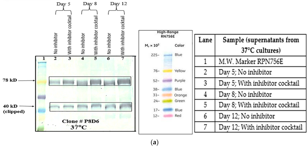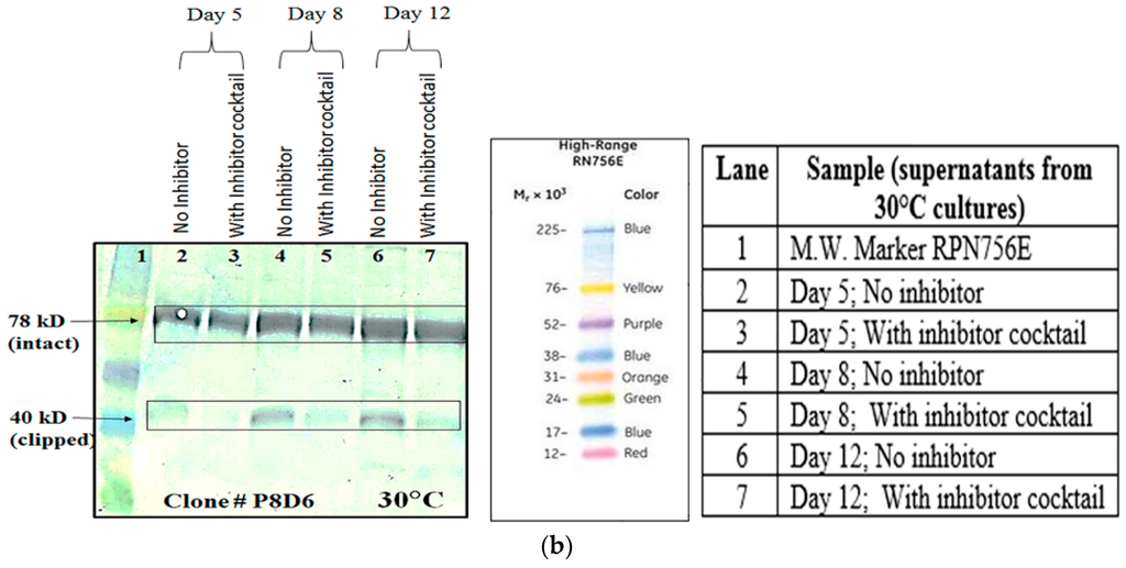 The P8D6 cultures were grown in the presence of protease inhibitor cocktail at 37 and 30 °C in order to study the individual as well as additive effect of cocktail inhibitors with low temperature, if any, on proteolysis inhibition. It was observed, as of day 12, that culturing cells alone at 30 °C definitely reduced protein clipping relative to 37 °C (Lane 6; Figure 3a,b) and addition of protease inhibitor cocktail further prevented the degradation process (Lane 7; Figure 3a,b).