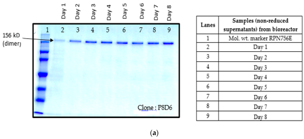 (a) SDS-PAGE of supernatant samples of bioreactor culture on various days (non-reduced); (b) SDS-PAGE of supernatant samples of bioreactor culture on various days (reduced); (c) Western blot of samples from bioreactor (reduced); (d) Western Blot of VEGFR1(D1–D3)-Fc purified fractions from SP-Sepharose cation exchange chromatography (reduced samples).