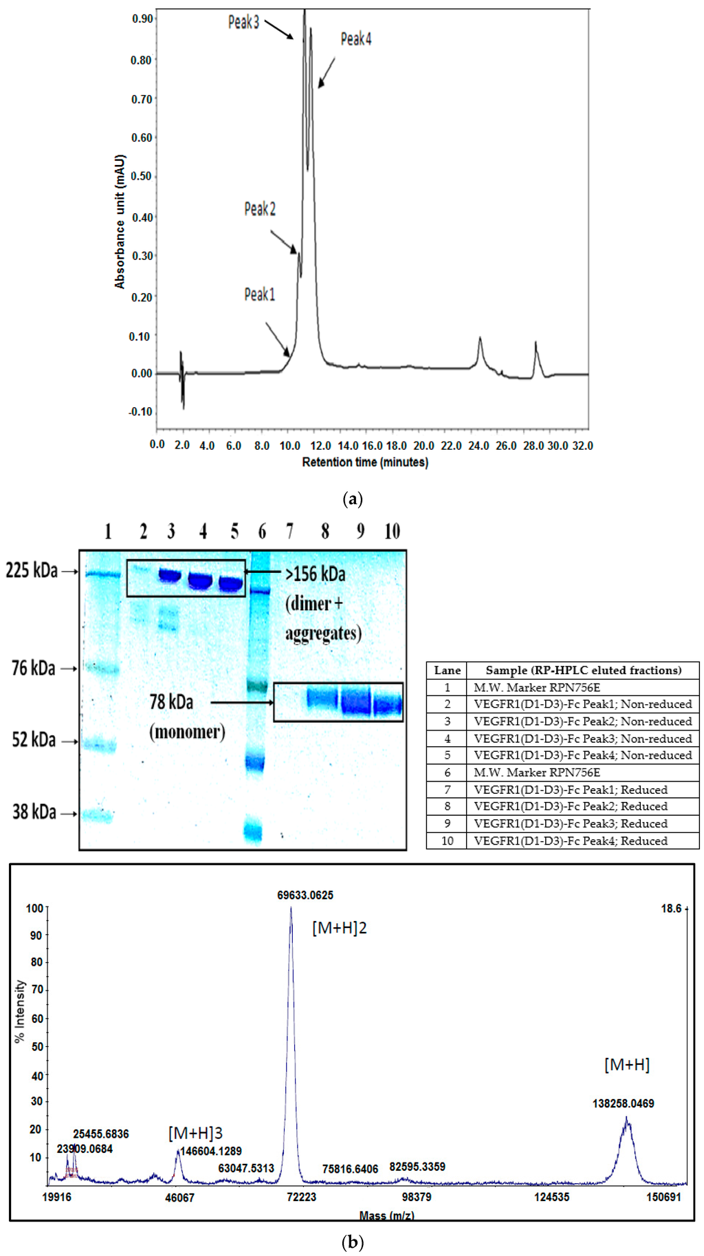 The overall molecular size and the presence of aggregated species and low molecular weight impurities were determined by Size-Exclusion HPLC analysis. SEC-HPLC chromatograms of VEGFR1 (D1–D3)-Fc are shown in the Figure 5e. An analytical gel filtration chromatographic column, TSK column was used for testing: Tosoh-Gel, G-3000 SWXL (TOSOH; catalogue number 08541, Tokyo, Japan); 7.8 mm internal diameter; 30 cm length; 5 micron particle size; 250° pore size. A total of 15 μg of protein was injected onto the column. Mobile phase used was 20 mM phosphate buffer containing 400 mM sodium chloride, pH 7.0. Flow rate was 0.5 mL/min a run time was 35 min with a UV detector (Tosoh, Tokyo, Japan) at 214 nm wavelength.
